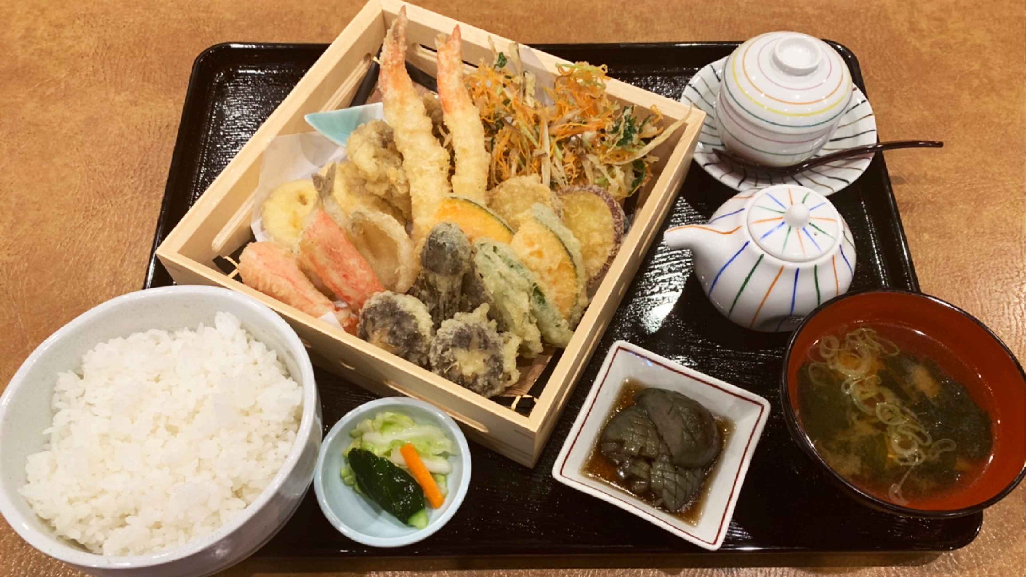 (天婦羅、茶碗蒸し、小鉢二品、お新香、汁物、ご飯)